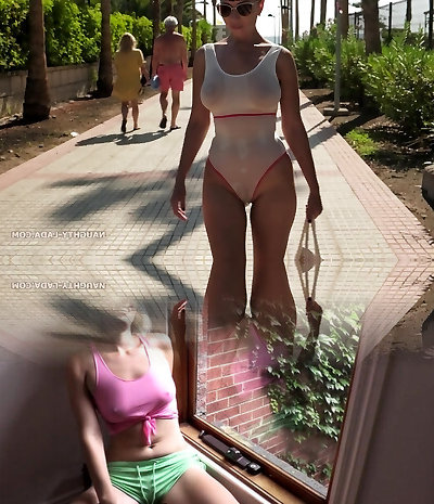 Busty Cougar is walking nearly naked on the public beach making everyone blush