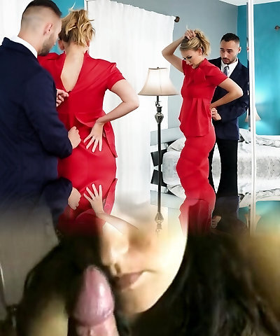 Jasmine Daze wearing red lingerie enjoys while sucking a dick