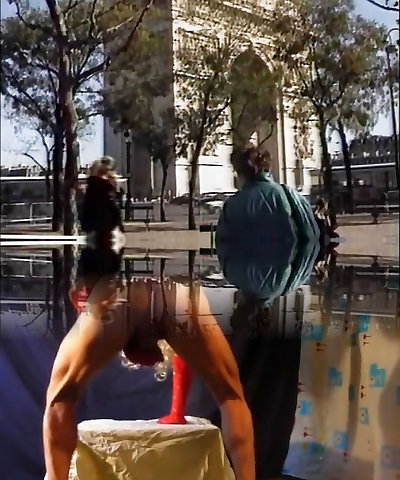 Busty bizarre babe fucks a gigantic fuck stick outdoors